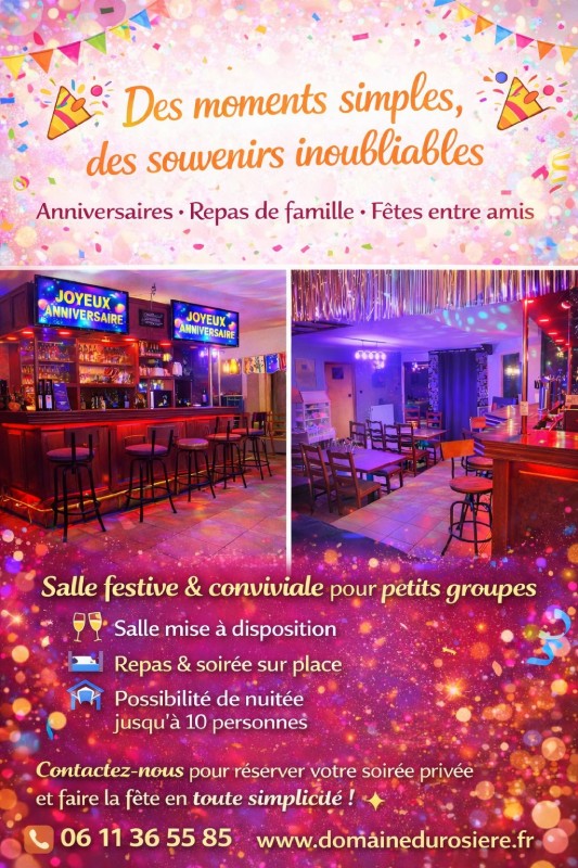 Nos salles festives et conviviales accueillent vos anniversaires, repas de famille et fêtes entre amis dans une ambiance colorée et animée. Bar équipé, espace pour dîner sur place et possibilité de prolonger la soirée en toute sérénité… tout est pensé pour partager des souvenirs inoubliables en petit comité.